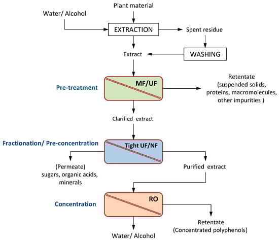 Agro-food wastewaters contain considerable amounts of high molecular weight solutes in the shape of suspended solids and colloidal particles identified as detrimental from a bioactivity perspective. Physical and physico-chemical processes (screening, sedimentation, centrifugation, adsorption, etc.) are used as primary separation (as pre-treatment) to remove suspended solids or other impurities. Because of this purpose, the use of UF and MF processes has been often introduced in integrated systems for recovery of phytochemicals from agro-industrial by-products as preliminary step, in alternative to the use of conventional systems based on the use of adsorbents and filter aids, before a fractionation step performed by using tight UF and/or NF membranes [49]. The general flow-sheet for the recovery of phenolic compounds from vegetable sources is illustrated in Figure 4. Typical selected applications are reported in the following.