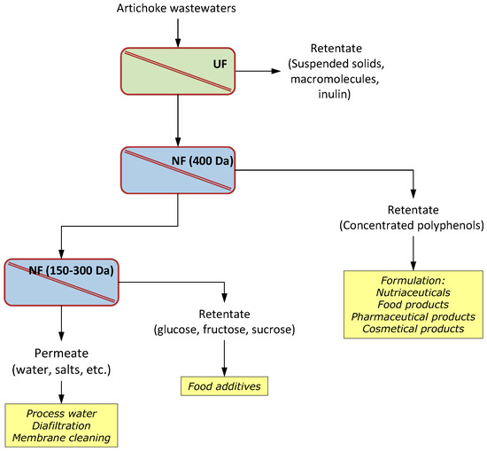 The use of PES hollow fiber UF membranes with a MWCO of 50 kDa allowed to produce a clear solution depleted in suspended solids and enriched in phenolic compounds from raw artichoke extracts [58]. Similarly, ceramic UF membranes of 15 kDa produced a clarified fraction depleted in suspended solids and macromolecular compounds from artichoke wastewaters produced in the blenching step [59]. Cassano et al. [60] reported the use of cellulose triacetate UF membranes with MWCO of 150 kDa in hollow fiber configuration (FUC 1582, Microdyn-Nadir, Wiesbaden, Germany) for the removal of suspended solids from artichoke brines. In all these approaches the use of UF allowed to reduce fouling phenomena in the subsequent NF process.