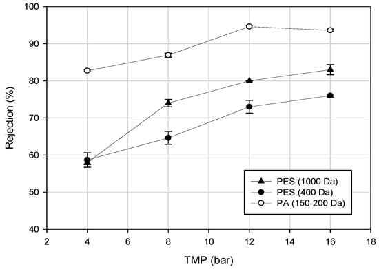 The rejection of total PPs for different NF membranes in the treatment of clarified bergamot juice is shown in Figure 6. The increase of operating pressure in the range between 4 and 16 bar for the selected membranes resulted in an increased rejection of phenolic compounds [67]. Giacobbo et al. [72] found a linear relationship between TMP and rejection of phenolic compounds (in the range 3–15 bar) in the treatment of second racking wine lees by using a composite fluoro polymer UF membrane with a MWCO of 1 kDa (Etna 01PP, from Alfa Laval).
