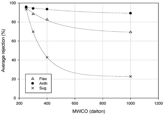 Nanofiltration of orange press liquor. Average rejection values of flavonoids, anthocyanins and sugars as a function of MWCO [80].