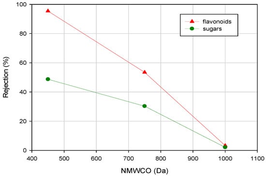 In a previous study, the same authors tested different UF and NF membranes and their performance in the separation and concentration of PPs from ultrafiltered bergamot juice [66]. In particular, the ultrafiltered juice was treated with a UF membrane (Etna 01PP, from Alfa Laval) and two different ceramic NF membranes (monotubular TiO2 membranes, 750 and 450 Da from Inopor) in order to evaluate the effect of the MWCO on the rejection by the membranes towards sugars, organic acids and PPs. The effect of MWCO on the rejection of sugars and flavonoids is illustrated in Figure 8.