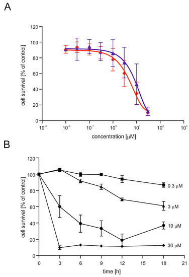 The toxic effects of CGS7181 and CGS7184 were dose dependent (Figure 4A). Next, we verified the time dependence of CGS7184 toxicity using the MTT assay (Figure 4B). High doses of CGS7184 rapidly induced cell death. For example, after 12 h, treatment with 10 µM of CGS7184 resulted in the death of almost 80% of the cells, while 3 h of incubation with 30 µM CGS7184 resulted in the death of over 90% of the cells.