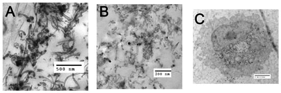 TEM images of particles and macrophage ingestion of MWCNTs: (A) TEM of source raw MWCNT; (B) TEM of carboxylated f-MWCNT16.2; and (C) TEM of macrophage internalizing source raw MWCNT (50 μg/mL) after 4 h.