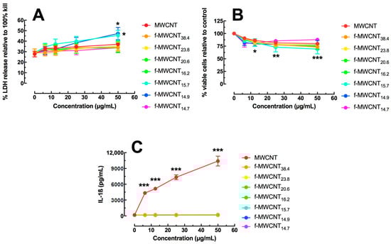 Effect of functionalized MWCNT on THP-1 macrophage-like cells in an in vitro 24 h culture. (A) Cell toxicity determined by LDH activity in cell media. Data expressed as mean LDH percent ± SEM compared to 100% cell death. (B) Cell toxicity determined by MTS assay. Data expressed as mean ± SEM viability relative to control cultures (0 μg/mL). (C) IL-1β release expressed as mean ± SEM pg/mL. Asterisks *** indicate p < 0.001, ** p < 0.01, or * p < 0.05 compared to 0 μg/mL concentration.