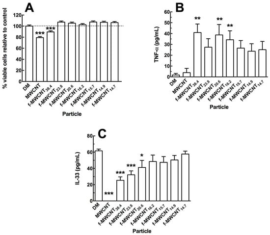 Effect of functionalized MWCNTs on A549 lung epithelial cells in an in vitro 24 h culture. (A) Cell toxicity determined by MTS assay. All particle concentrations were at 50 μg/mL. Data expressed as mean ± SEM optical density at 490 nm. (B) TNF-α release expressed as mean ± SEM pg/mL. (C) IL-33 release expressed as mean ± SEM pg/mL. Asterisks *** indicate p < 0.001, ** p < 0.01, or * p < 0.05 compared to appropriate control condition (no particle cultures (DM) or source MWCNTs (B only)).