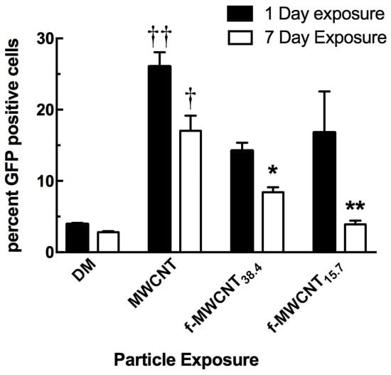 MWCNT functionalization effects autophagy as seen by GFP LC3 detection following particle instillation. One-day particle instillation of 50 μg indicated by dark bars. The seven-day instillation of 50 μg indicated by white bars. Data are expressed as mean ± SEM percent macrophages expressing LC3 green fluorescent protein, which indicates the presence of autophagic activity. Functionalization of 38.4 is 5 min of processing and 15.7 is 60 min of processing. Daggers †† indicate significance at p < 0.01, or † indicating significance at p < 0.05 compared to corresponding DM vehicle negative controls. Asterisks ** indicate significance at p < 0.01, or * indicating significance at p < 0.05 compared to corresponding MWCNT source controls. n = 3–4 mice per group.