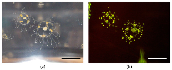 Figure 1. A jellyfish Scolionema suvaense. (a) Image under ambient light. (b) Fluorescence image under blue LED (470 nm) illumination. Green fluorescence was observed through an orange transparent acrylic plate (A300, Hikari Co., Ltd., (Osaka, Japan). Scale bars are 10 mm.