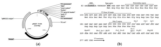 Expression vector pRSET-TriEX was constructed as follows. Forward and reverse DNA oligomers that contain (dT)14 were synthesized by Integrated DNA Technologies (IDT). The forward oligomer BamHI-TriEX_f (GAT CTT TTT TTT TTT TTT CCC GGG ATC GAT GTC GAC G) and reverse oligomer BamHI-TriEX_r (GAT CCG TCG ACA TCG ATC CCG GGA AAA AAA AAA AAA A) were annealed to form double-stranded DNA fragments, which have sticky ends to BamHI sites. The 5′ ends of the double-stranded DNA fragments were phosphorylated with T4 Polynucleotide Kinase (M0201S, New England Biolabs Inc., Ipswich, MA, USA). pRSET B was digested with BamHI, and 5′ phosphate groups were removed using Antarctic Phosphatase (M0289S, New England Biolabs Inc.). The DNA fragments containing (dT)14 sequences were inserted into the BamHI site using DNA Ligation Kit Version 1.0 (Takara Bio Inc., Kusatsu, Japan). E. coli competent cells (JM109(DE3), Promega Corporation, Madison, WI, USA) were transformed with the constructed vector. Miniprep was performed with 2 mL of culture in a Luria Bertani (LB) medium supplemented with 100 µg/mL ampicillin (Amp), and the sequence was checked to ensure the vector is correctly constructed.