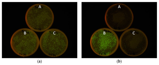 Expression level was visually inspected in terms of brightness from colonies expressing eGFP. The eGFP gene with three frames after the BamHI site was amplified by PCR. Three forward primers with different reading frames—BamHI-eGFP-F (CGG GAT CCG TGA GCA AGG GCG AGG AG), BamHI-C-eGFP-F (CGG GAT CCC GTG AGC AAG GGC GAG GAG), and BamHI-CC-eGFP-F (CGG GAT CCC CGT GAG CAA GGG CGA GGA G)—together with an identical reverse primer—EcoRI-eGFP-R (CCG GAA TTC TTA CTT GTA CAG CTC GTC CAT GC)—and the template eGFP/pREST were used for PCR to amplify the gene encoding eGFP with frame shifts. After PCR amplification of the eGFP gene, primers were removed using PCR Purification Kit (QIAquick PCR Purification Kit, Qiagen, Hilden, Germany). The PCR amplicons were digested with BamHI and EcoRI and purified by running on an agarose gel followed by gel-extraction (QIAquick Gel Extraction Kit, Qiagen). Each frame-shifted gene encoding eGFP was introduced to pRSET B and pRSET-TriEX at the BamHI/EcoRI site. JM109(DE3) were transformed with the plasmids constructed, and fluorescence intensities were checked after overnight incubation at 37 °C. The digestion of the amplicons was performed prior to removing the PCR template plasmid, from which a trace amount of B frame gene encoding eGFP can be formed. Hence, a small amount of the B frame gene can be included in the A frame and C frame genes, which is a cause of pseudo-positive fluorescent colonies. The plates were illuminated with Transilluminator (TFML-26, UVP, LLC, Upland, CA, USA) equipped with Visi-Blue Plate (with Orange Cover) and imaged with a digital camera (PowerShot G11, Canon, Tokyo, Japan). The two pictures in Figure 3a,b were taken with identical exposure conditions. The exposure time was 4 s and the f-number was f/4.