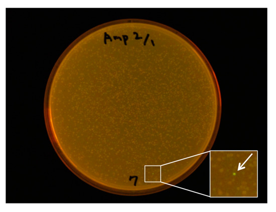 Figure 4. Expression cloning of fluorescent protein from Scolionema suvaense with the frame-insensitive pRSET-TriEX vector. Screening of 3658 colonies in total was performed and one green fluorescent colony was found only on the plate, shown here in the bottom right corner.