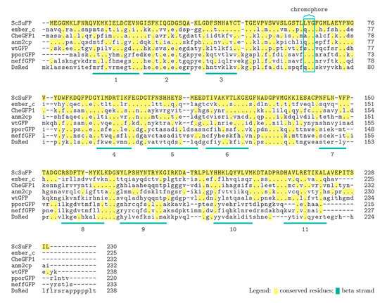 Figure 5. Alignment of the amino acid sequence of ScSuFP with ember_c, CheGFP1, anm2cp, wtGFP, pproGFP, meffGFP and DsRed. Identical amino acids are indicated with dots and highlighted with yellow color. Non-conserved residues are shown in lowercase and have no highlighting. The positions of chromophores are enclosed in a box. Beta-strands are underlined and numbered based on the wtGFP sequence. The alignment was made using Clustal Omega (Available online: https://www.ebi.ac.uk/Tools/msa/clustalo/) and the highlighting/labeling with TEXshade (Available online: https://www.uni-kiel.de/pharmazie/chem/Prof_Beitz/texshade.html) [24,25,26].