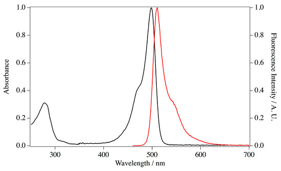 Next, the CDS of ScSuFP was extracted by PCR amplification and subcloned into an empty pRSET B vector. Recombinant ScSuFP was expressed in E. coli transformants with this plasmid and purified by metal chelating column chromatography. Imidazole in the eluate was removed by pathing through a desalting column. The purified protein appeared as a single band on SDS PAGE at the estimated size of 30 kDa. Absorption and fluorescence spectra were measured for the purified ScSuFP (Figure 6). The absorption band at 280 nm was assigned to amino acid residues and a structured visible band was assigned to the chromophore. The absorption maximum of the visible band was at 498 nm and the molar extinction coefficient was 1.17 × 105 M−1·cm−1 [27,28]. The protein concentration to estimate the extinction coefficient was determined by the alkaline-denatured method, which reflects the concentration of matured chromophore. The concentration was >90% of the total ScSuFP determined with the theoretical extinction coefficient at 280 nm, which was calculated based on the amino acid sequence, suggesting a good folding of ScSuFP in the bacteria. The emission spectrum has a maximum at 511 nm and the fluorescence quantum yield was calculated to be 0.6 using the comparative method.