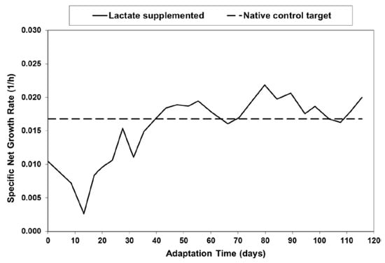 Specific net growth rate in lactate-supplemented medium as a function of adaptation time for batch shaker flask cultures.