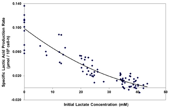 Effect of initial lactate concentration on specific lactic acid production rate in batch shaker flask cultures.