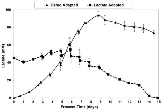 Lactic acid has a pKa value of 3.87 and will dissociate under physiological conditions to lactate and a hydrogen molecule. Although the entire reaction path to lactate involves multiple steps through glycolysis, a branch point exists at pyruvate, which can either flux toward the tricarboxylic acid (TCA) cycle for the continued production of ATP or be reduced to lactate and contribute to culture acidity [80], as shown in Equation (2):