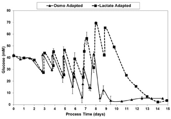 Although complex systems with the four components above have been successfully used many times in laboratory-scale bioreactors, and have repeatedly shown substantial benefits at the lab scale in both academia and industry, they have never, to our knowledge, been implemented as part of a licensed, large-scale animal cell culture process. Even for E. coli production cultures, with durations of only 1–2 days, there are substantial challenges around continuous feeding of nutrients in large-scale, cGMP operations [51,52]. For animal cell production cultures, with durations that are typically at least 10–15 days, these challenges increase, as the system must perform continuously without problems for a much longer period. The chance of run failure is considered too high, not only due to the complexity of the system, but also due to the resulting risks around contamination and robust feedback control at “near failure” nutrient levels. Glucose depletion can lead to apoptosis and premature cell death [53] or affect product quality by reducing glycosylation [39,54]. Accordingly, glucose levels for most industrial fed-batch processes are held above 1 g/L or higher [31,38], well above the much lower range required to reduce lactic acid production.