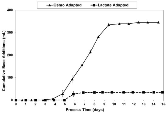 2.3. Lactic Acid Production, Base Addition, and Osmolality Profiles in Fed-Batch Bioreactor Cultures