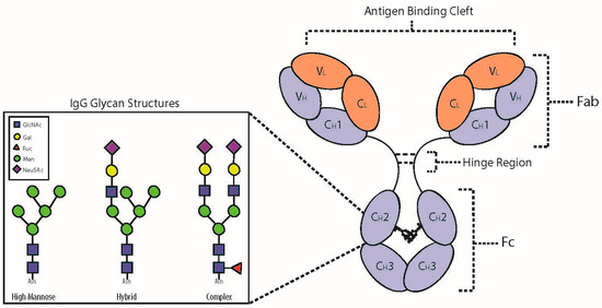 Immunoglobulin G (IgG) is an important effector glycoprotein linking the innate and adaptive branches of the immune system. It has the ability to exert both anti-inflammatory and pro-inflammatory responses throughout the body, which are triggered by antigen recognition, and are dependent on its affinity for a number of different activating or inhibitory fragment crystallisable receptors (FcRs) and complement factors. This process mediates key effector functions, including pathogen clearance, antibody-dependent cell cytotoxicity (ADCC), and complement-initiated inflammation, all with both beneficial and detrimental effects depending on the premise of the IgG activity. For example, during primary bacterial infection, IgG can initiate opsonisation through complement activation and phagocytosis of the bacterial cells by macrophages, monocytes and neutrophils, as well as neutralise endotoxins and exotoxins [1,2,3]. These beneficial effects are well-established and have been harnessed in the form of intravenous immunoglobulin therapy in immunodeficient individuals [4]. On the contrary, there are examples where these effects are detrimental, such as in rheumatoid arthritis patients [5,6,7]. In this instance, IgG is thought to tandemly bind synovial cells and mannose-binding lectin (MBL), resulting in the initiation of the lectin complement cascade and secondary damage of surrounding tissues within the synovial joints [5,6,7]. These immune responses are largely modulated by the fragment crystallisable (Fc) domain of the IgG glycoprotein (Figure 1).