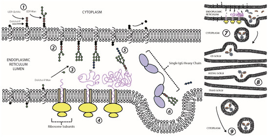 N-glycans are biosynthesised sequentially (Figure 2) and in tandem to protein biosynthesis, commencing on the membrane of the endoplasmic reticulum (ER). Here, sugar nucleotides assemble onto a dolichol pyrophosphate donor molecule on the cytoplasmic side of the ER membrane to form a mannose (Man)5 N-acetylglucosamine (GlcNAc)2 oligosaccharide [16]. The structure is subsequently inverted to be on the luminal side of the membrane and extended by a further four Man and three glucose (Glc) sugar nucleotides before the dolichol-bound Glc3Man9GlcNAc2 oligosaccharide, termed a precursor N-glycan, is transferred to an Asn recognition sequence by oligosaccharyltransferase [12]. The HC and LC polypeptides are then folded and the nascent IgG assembled into its respective form. Following removal of the three terminating Glc via two trimming steps, the glycoprotein with attached Man9GlcNAc2 oligosaccharides is transferred to the cis portion of the Golgi apparatus for further glycoprocessing [25,26]. Different glycosylhydrolases and glycosyltransferases remodel the branched IgG glycan structure throughout the glycoprocessing steps, from the cis Golgi to the trans Golgi [27]. Variation in these enzymatic processes results in diversification of the IgG N-glycome composition.