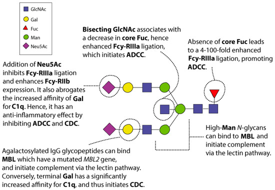 Glycosylation of the IgG Fc domain is associated with activation of all three complement cascades. Namely, the addition of terminal Gal is associated with significantly increased affinity for the C1q component of the classical pathway [49]. The addition of terminal Neu5Ac, however, abrogates the effect of increased affinity of galactosylated IgG Fc for the C1q component, leading to an FcR-independent anti-inflammatory response [39]. On the contrary, a decrease in terminal Gal or increase in high-Man glycoforms may be associated with an increased affinity for MBL of the lectin pathway [50] and C3b of the alternative pathway [16].