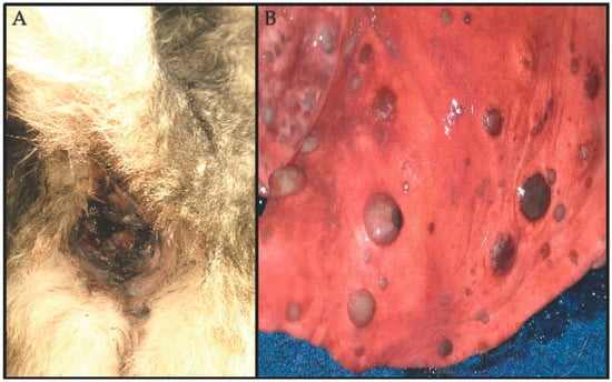 Clinicopathological manifestations of mucosal melanoma in dogs. (A) Canine mucosal melanoma involving the anorectal area of a dog. There is a darkly pigmented (melanized) mass involving the mucous membranes of the anus. (B) Pulmonary metastasis of a mucosal melanoma. Circumscribed nodular metastatic lesions with varying degrees of melanin pigmentation are disseminated in the lung parenchyma, visible at the visceral pleura, of an autopsy specimen (different dog from image in (A)). Lesion photographs were kindly provided by Dr. Jeff Caswell, Department of Pathobiology, Ontario Veterinary College, University of Guelph, Guelph, Ontario, Canada.