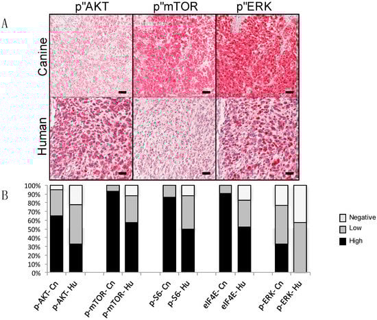 Activation of ERK and PI3K/AKT/mTOR signal transduction pathways in human and canine mucosal melanoma detected by immunohistochemistry on primary tumor tissue arrays. (A) Representative immunopositive reactions for pathway mediators are illustrated. Phospho-specific primary antibody signal detection with red chromogen and hematoxylin counterstain. Bars = 50 μm. (B) Percentages of immunopositive melanomas for selected canine (Cn, n = 43) and human (Hu, n = 40) signal transduction mediators. Relative intensity and percentages of immunolabeled cells were considered in scores, assigned as negative, low, and high. Used by the authors with permission under Creative Commons Attribution License [].