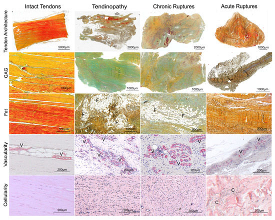 Exemplary histologies of intact tendons, tendinopathic tendons, chronic ruptures and acute ruptures using Movat Pentachrome (MP) staining (tendon architecture, glycosaminoglycan (GAG) and fat tissue (lipid vacuoles)), α smooth muscle actin (αSMA) staining (vascularity) and Hematoxylin Eosin (HE) staining (cellularity). F: fat tissue, V: vessels, C: cell clusters. The Movat Pentachrome staining used stains collagen in yellow to brown, mature collagen in red [31], GAG ground substance in turquois, cell nuclei in blue to black and cytoplasm stains reddish.