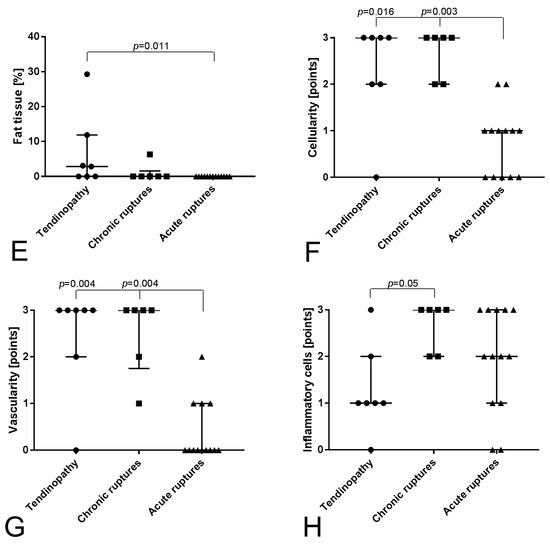 Evaluation of histological score: (A) Total histological score reaching 18 points as maximum, which would indicate a highly degenerated tendon. (B) Tendon architecture as indicator for the disturbance of the tendon structure (0–3 points). (C) Amount of aligned collagen quantified using ImageJ (0–100%). (D) GAG content (0–3 points, MP staining). (E) Fat tissue quantified using ImageJ (0–100%, MP staining). (F) Cellularity (0–3 points, HE staining). (G) Vascularity (0–3 points, αSMA staining). (H) Inflammatory cells (not included in histological score, CD45 staining). Data are given as individual dot plots with median and interquartile range.