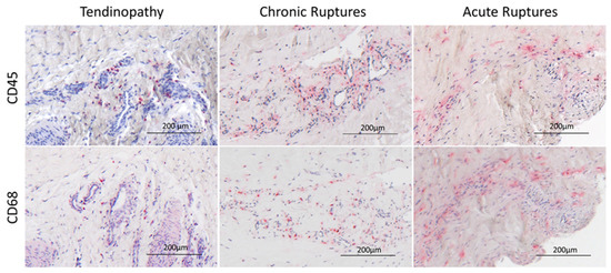 Exemplary images of inflammatory cell infiltration visualized by immunohistological CD45 (leucocytes) and CD68 (monocytes/macrophages) staining in tendinopathic tendons, chronic ruptures and acute ruptures.