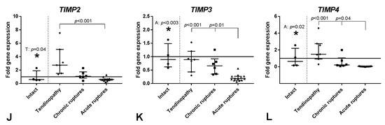 The expression of the MMP inhibitors was differentially regulated. TIMP1 expression was significantly higher and TIMP3 and TIMP4 expression significantly lower in the acute ruptured tendons compared to the other groups. TIMP2 expression was significantly elevated in the tendinopathy group compared to the intact tendons and acute ruptures (Figure 4I–L).