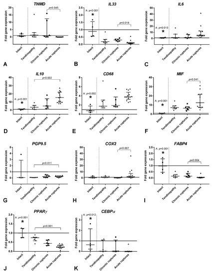 Relative gene expression of TNMD (A), the inflammatory cytokines IL33, IL6 and IL10 (B–D), the immune cell marker CD68 (E), the nerve markers MIF and PGP9.5 (F–G), the pain marker COX2 (H), and the fat markers FABP4, PPARγ and CEBPα (I–K) in tendinopathic tendons, chronic ruptures and acute ruptures given as fold to intact tendon tissue (horizontal line, mean value = 1). qRT-PCR data were normalized to the expression of the house keeping gene 18S rRNA with efficiency correction and presented as fold change to the mean of the intact tendons. Results are shown as individual dot plots with median and interquartile range. Significant differences between the intact tendons and the three tendon pathology groups are marked with a star (*) above the intact tendon and the respective significant group (T: tendinopathy, C: chronic ruptures, A: acute ruptures) and the p-value. The vertical dashed line separates the intact group from the tendon pathology groups. Significant differences between the three tendon pathology groups are marked with a spanning line above the groups and the individual p-values. p ≤ 0.05 was considered as statistically significant.