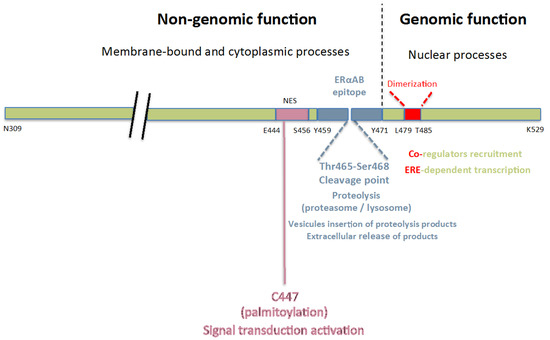 Schematic representation of the regulatory platform of the E2-binding core of ERα (N309-K529), postulated to mainly contribute to the onset of non-genomic and genomic responses induced by E2 and ERαABs. The ERαABs’ epitope (Y459-E471) occupies a central, pivotal position localized between two motifs, each of them being implicated in one of these two types of responses (non-genomic, E444-S456; genomic, L479-T485). Functions of these three amino-acids sequences, as well as biological consequences resulting from E2/ERαABs binding and consecutive activation of related inter-relationships between motifs of the platform are defined below (for details, see Section 3.3).