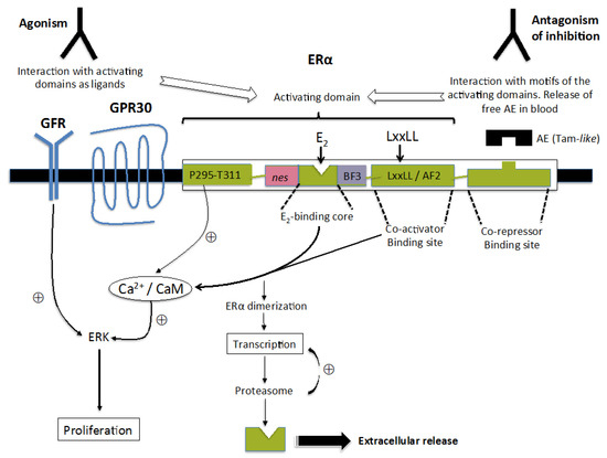 Schematic representation of ERαABs-induced mechanisms initiated at the plasma membrane to promote enhanced proliferation and ERE-dependent transcription. Reported ERαAB activities (agonism, antagonism of inhibition) were integrated in a classical model explaining co-operation between binding sites for growth factors and steroid hormones in the onset of non-genomic and genomic responses [11,12,14,27,33,37,38]. Note the pivotal role of the Ca2+/calmodulin complex in the inter-relationships between GPR30 and recruitment sites of the receptor for ERαABs and adjacent co-activators. AE: antiestrogen; Tam-like: Tamoxifen-like.