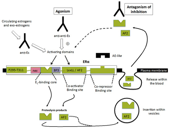 Schematic representation of suspected mechanisms able to contribute to ERαABs’ emergence. Agonists: antibodies able to mimic the action of circulating estrogens (natural, synthetic and xenoestrogens). Anti-antagonists: antibodies against a natural extra-cellular repressor recognizing a specific inhibitory site of ERα or preventing the access of activating modulators to the receptor by a competitive binding process. ERα degradation products including binding sites for estrogens or LXXLL motifs of co-activators [24], released within the blood, may generate this last class of antibodies. Es: Estrogens, BF3: Binding function 3, AF2: Activation function 2.