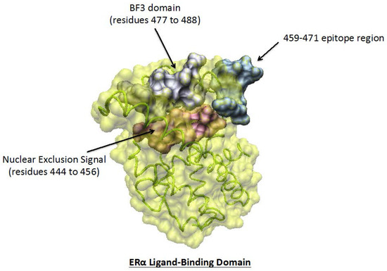 Surface structure of the BF3- (in grey) and ERαAB epitope/E2 (in blue)-binding domains of the human estrogen receptor α (ERα in yellow, Connolly surface). The BF3 domain is composed of two regions, i.e., the 365–369 type II β-turn region and the 477–488 helix 10 (H10) region, the latter overlapping the 479–485 sequence implicated in the dimerization of the receptor. The ERαABs epitope is in close contact with this BF3 domain, as well as the 444–456 nuclear exclusion site (nes, for nuclear exclusion signal, in pink). Interaction between the 301–311 region with the 365–269 type II β turn seems to repress the dimerization potency of the 477–488 helix. Transparency allows the visualization of the helices (in green) that comprise the receptor.