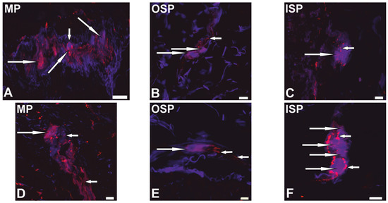 Distribution pattern of neurons (long arrows) and nerve fibers (short arrows) immunoreactive to protein gene-product 9.5 (PGP 9.5, blue) and cocaine- and amphetamine-regulated transcript (CART, red) within the myenteric plexus (MP), outer submucous plexus (OSP), and inner submucous (ISP) plexus of the control (A–C) and cancer-affected (D–F) human colonic wall. Figures (A–F) show the overlap of both stainings. Scale bar = 20 µm.