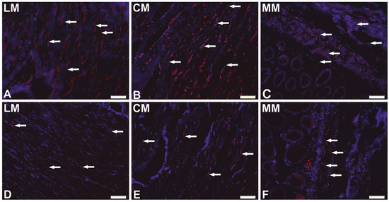 Distribution pattern of nerve fibers (arrows) immunoreactive to CART within longitudinal muscle (LM) and circular muscle (CM) layers, as well as lamina muscularic mucosa (MM), in control (A–C) and cancer-affected (D–F) areas of the human colonic wall. Scale bar = 100 µm.