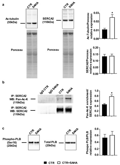 Co-immunoprecipitation experiments revealed that SAHA increased SERCA2 acetylation level (Figure 1b and Figure S1), without inducing significant changes in SERCA2 protein expression (Figure 1a). The ratio of phosphorylated phospholamban (PLB)/total phospholamban (Figure 1c) remained unchanged.