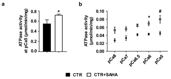 To investigate whether increased acetylation could also affect SERCA2 functional properties, ATPase activity was measured on microsomes [19] isolated from both CTR and CTR+SAHA CMs. HDAC inhibition resulted in an increase of ATPase activity when microsomes were exposed to 10 µM calcium concentration (corresponding to pCa5) [20,21] (Figure 2a).