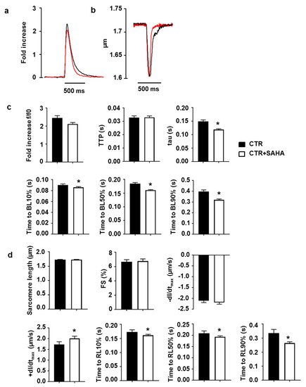 The treatment with SAHA ameliorated intracellular Ca2+ dynamics and, accordingly, contractile performance of adult rat CMs. These findings support the hypothesis that the inhibition of SERCA2 deacetylation induced by SAHA plays a crucial role in promoting a more efficient SR calcium re-uptake, which in turn results in a higher rate of re-lengthening and shorter relaxation times [35].
