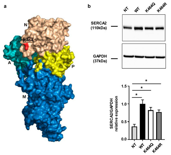 Analysis of human SERCA2a mutants transfected in HEK cells: bioinformatics prediction and protein expression. (a) Molecular surface view of predicted hSERCA2a. Domains are visualized in different colors: Actuator (A) in light blue, transmembrane (M) in dark blue, phosphorylation (P) in yellow and nucleotide-binding (N) in beige. K464 is highlighted in red; (b) Western blot analysis of SERCA2 expression in stable transfected HEK cells. Densitometry is reported in the bar graph (n = 8). Ordinary one-way ANOVA followed by Bonferroni’s multiple comparison: p < 0.005 vs. NT.
