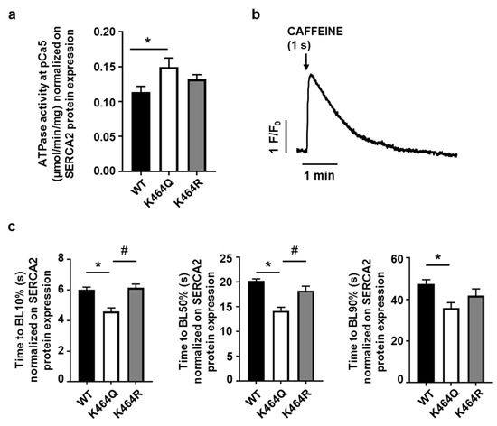 The effects of mutagenesis were evaluated on ATPase activity measured in the microsomal fraction isolated from transfected HEK cells. In order to take into consideration the possible impact of different level of protein expression on hSERCA2a function, the values of ATPase activity recorded for each sample were normalized to the correspondent SERCA2 expression evaluated by Western blot on cells obtained from the same sample (Figure 4b). Taking into account the variable amount of SERCA2 expression in each cell line and for each experiment, we observed that SERCA2 function was significantly ameliorated in mutants where K464 were mutated into Q compared with WT (Figure 5a). Conversely, the K464R mutant did not show any differences in comparison with the WT (Figure 5a). Thus, constitutive acetylation of hSERCA2a K464 improved hSERCA2a ATPase activity, while K464 mutation into R (constitutive deacetylation) did not have a significant effect (Figure 5a). Importantly, untransfected HEK cells responded with a transient increase of intracellular calcium concentration to caffeine puff (1 s, 10 mM, Figure 5b). Therefore, we further evaluated the effects of SERCA2a mutagenesis on calcium transients induced by caffeine in HEK cells loaded with the calcium sensitive dye Fluo-4. Again, in order to consider the effects of different SERCA2 protein levels in HEK mutants, calcium transients were corrected on the mean SERCA2 expression detected by Western Blot in the correspondent cell line. The constitutive acetylation of SERCA2 K646Q promoted an acceleration of Ca2+ transient recovery phase at BL10%, BL50% compared to WT and K464R (Figure 5c), thus indicating that constitutive acetylation of K464 has a positive impact on hSERCA2a function.