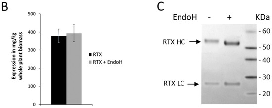 The genetic sequences of antibodies’ heavy and light chains and Endoglycosidase H (GenBank: AAA26738.1) were each fused to the barley α-amylase signal peptide sequence (GenBank: CAX51374.1). For rituximab sequences, the DrugBank accession DB00073 was used where a valine residue at position 219 (original to human IgG1) was described while in the original patent (US patent No. 5736137), Rituxan® has an alanine residue substitution at position 219. Antibodies’ heavy and light chain genes were cloned into magnICON® TMV- and PVX plant expression vectors (Icon Genetics GmbH, Halle, Germany) [72], respectively. The Endoglycosidase H gene was fused to genetic sequences of the endoplasmic reticulum (ER) retrieval peptide SEKDEL and the epitope Flag tag at the 3’ end before being cloned into the binary vector pGREENII (John Innes Center, Norwich, UK; GenBank: EF590266.1) [73]. All DNA sequences were codon optimized for expression in Nicotiana benthamiana and synthesized by ATUM (Newark, CA, USA) for the antibody genes and Eurofins MWG operon (Louisville, KY, USA) for the Endoglycosidase H gene. All expression vectors were then mobilized separately into Agrobacterium tumefaciens strain GV3101 by electroporation. The vector pGREENII containing the Endo-H gene was mobilized in Agrobacteria together with the helper vector pSOUP (John Innes Center, Norwich, UK) [73].