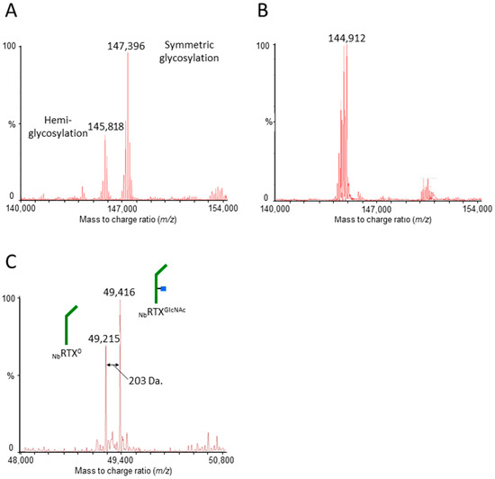 Nano liquid chromatography-electrospray ionization-quadrupole time of flight-mass spectrometry (NanoLC-QTOF-MS) analysis of plant-made rituximab. (A) Deconvoluted electrospray ionization (ESI)-mass spectrum of purified NbRTX analyzed under non-reducing conditions showing fully glycosylated and hemiglycosylated rituximab; (B) Deconvoluted ESI-mass spectrum of purified NbRTXGlcNAc analyzed under non-reducing conditions showing a decrease in molecular weight; (C) Deconvoluted ESI-mass spectrum of in vivo deglycosylated plant-made rituximab analyzed under reducing conditions. Note the mass shift between non-glycosylated rituximab heavy chain NbRTX0 (calculated m/z 49,217) and deglycosylated rituximab heavy chain NbRTXGlcNAc (calculated m/z 49,420). As comparison, the NanoLC-QTOF-MS analysis of Rituxan® is provided in Figure S2.