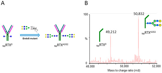 An endoglycosidase S mutant (EndoS D233Q) has been previously selected for the specific activity of rapid and robust transglycosylation of oxazoline glycans onto a single core GlcNAc attached to the protein asparagine residue [40]. Oxazoline glycans were prepared from pure sialylglycopeptide (SGP) isolated from chicken egg yolk, following the previously reported method [51,52]. In addition, a scalable acetone-water solution-based extraction has also been published capable of producing gram quantities of oxazoline glycan reagents [53]. Plant-derived NbRTXGlcNAc was used as the acceptor in the EndoS D233Q mediated transglycosylation reaction which enables the transfer of a complex N-glycan to the exposed GlcNAc residue to produce a A2G2 glycoform (Figure 3A). Liquid chromatography-electrospray ionization-tandem mass spectrometry (LC-ESI-MS) analysis confirmed the completion of the reaction showing the formation of a rituximab glycoform of 50,832 Da which corresponds to the A2G2 glycoform of the heavy chain of the IgG. Mass spectrometry analysis also revealed the specificity of the transglycosylation for the NbRTXGlcNAc species, as the non-glycosylated heavy chain fraction, which does not carry GlcNAc acceptor at position Asn297, remained unprocessed (Figure 3B).