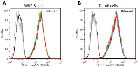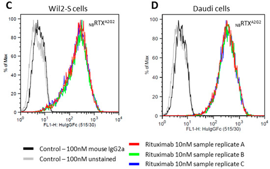 Rituximab mechanism of action relies on binding to the lymphoma cell marker CD20 before triggering cell cytotoxicity. Prior to performing CD20 binding assays, the percentage of CD20 antigen on cell surface of Wil2-S and Daudi lymphoma cells, standard lymphoma cell lines used for CD20 binding assays in oncology research, was first quantitated by flow cytometry using FITC-labeled mouse anti-human CD20 antibodies. It was found that 98.7% of Wil2-S and 99.4% of Daudi cells were CD20 positive under culture conditions (Figure S3). Since cells retained high expression of CD20, they were used for binding and cytotoxicity assays. The binding assay was carried out with 10 nM of NbRTXA2G2 and Rituxan® using flow cytometry. NbRTXA2G2 revealed similar binding affinity to Rituxan® when both Wil2-S and Daudi cells were used (Figure 4). Similar binding profiles were observed when 50 nM and 100 nM of rituximab samples were used. This demonstrated that the A2G2 glycoform status and the reglycosylation procedure did not impede the antibody binding capacity to target cells.