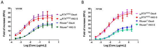 Antibody-dependent-cell-mediated cytotoxicity (ADCC) activity of Rituxan® and NbRTXA2G2 with (A) V/V 158 FcγRIIIa (high affinity) and (B) F/F 158 FcγRIIIa (low affinity) variant effector cells (engineered Jurkat cells with FcγRIIIa receptor). All experiments were carried out using human B lymphoma WIL2-S cells and Daudi cells as target cells. The effector cell: target cell ratio was 10:1. Data are expressed as fold of ADCC increase. Values represent mean ± S.D. for triplicate analyses.
