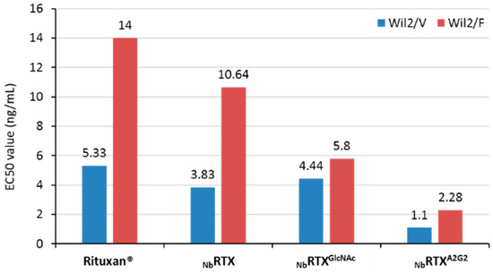 Comparison of EC50 values of Rituxan®, plant-made rituximab (NbRTX), deglycosylated plant-made rituximab (NbRTXGlcNAc), and reglycosylated plant-made rituximab (NbRTXA2G2) determined by the ADCC Reporter Bioassay using Wil2 V/V158 (Wil2/V) and F/F158 (Wil2/F) variant cells. The calculated EC50 values are shown above the respective histogram bars.