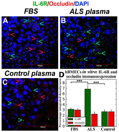 Results showed a significant (p < 0.001) increase of IL-6R immunoexpression in ECs by exposure to ALS plasma (Figure 1B,D) vs. plasma from control patient (Figure 1C,D) or FBS (Figure 1A,D). Also, occludin immunostaining displayed a tendency towards downregulation after adding plasma from an ALS patient (Figure 1D).