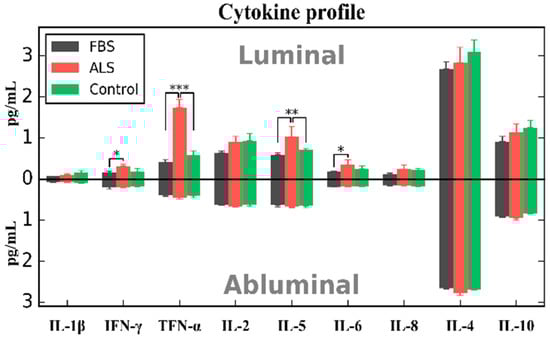Additionally, cytokine profile (IL-1β, IFN-γ, IL-2, IL-4, IL-5, IL-6, IL-8, IL-10, and TNF-α) using multiplex cytokine assay (Thermo Fisher Scientific, Waltham, MA, USA) as described [30] was performed in collected media supernatant from insert (luminal) and 24-well plate (abluminal) compartments prior to hBMEC fixation after 5 DIV of exposure to 10% FBS, plasma from ALS or control patient. Our preliminary data showed significantly elevated concentrations of IFN-γ (p < 0.05), TNF-α (p < 0.001), IL-5 (p < 0.01), and IL-6 (p < 0.05) cytokines at luminal (insert) compartment primarily after cell exposure to ALS plasma (Figure 2). However, significant difference in IFN-γ and IL-6 concentrations was shown only between ALS plasma and FBS exposures. Interestingly, no differences (p > 0.05) in cytokine levels were found between any cell culture conditions at abluminal (24-well plate) side.